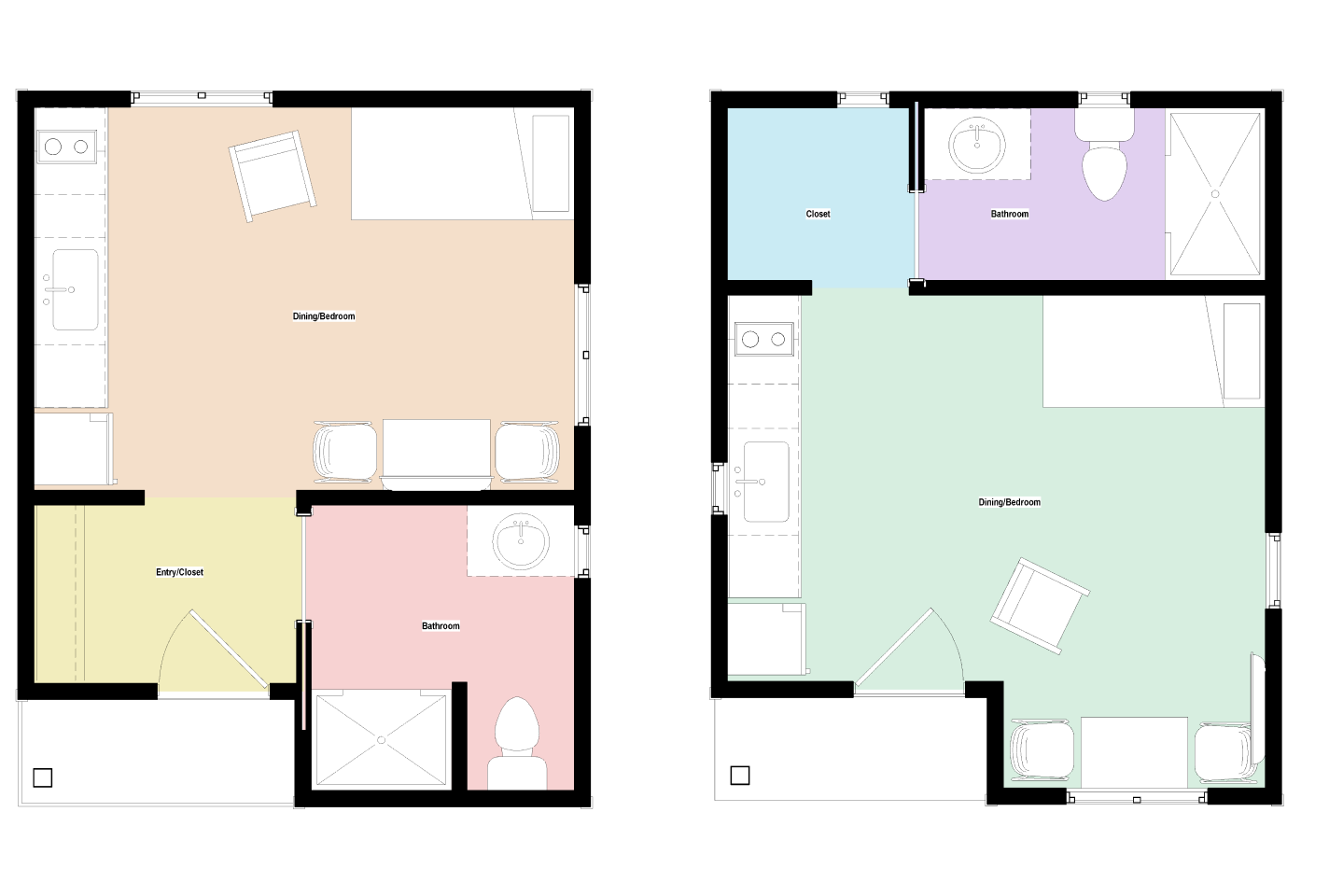 Each efficiency-styled home will be 320 square feet and feature a central area for living, dining, and sleeping. A bathroom and a general storage closet are included. Kitchens are outfitted with a two-burner induction cooktop, microwave oven, and an apartment-size refrigerator. These appliances are chosen for the safety of the community and each individual occupant. The home can be modified to meet each resident’s special needs.